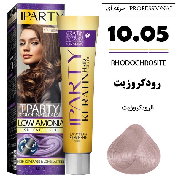 رنگ مو 10.05 TPARTY با تناژ رودکروزیت، انتخابی ایدهآل برای افرادی است که به دنبال رنگی بسیار روشن، گرم و با تهرنگ ملایم و زیبا هستند این شماره پایه بلوند خیلی روشن را با تناژ رودکروزیت ترکیب کرده و جلوهای شفاف، درخشان و مدرن روی مو ایجاد میکند رنگ رودکروزیت برای انواع رنگ پوست مناسب است و بهویژه روی پوستهای روشن و گندمی جلوهای طبیعی، شیک و حرفهای ارائه میدهد.