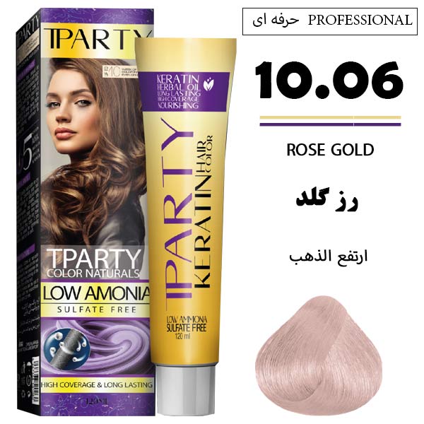 رنگ مو 10.06 تی‌پارتی با فرمول کم‌آمونیاک و ترکیبات مغذی شامل روغن آرگان، کراتین و پروتئین هیدرولیزه، رنگی رزگلد روشن، شفاف و گرم ایجاد میکند که ضمن پوشش‌ دهی یکنواخت، نرمی، لطافت و سلامت تارهای مو را حفظ میکند.