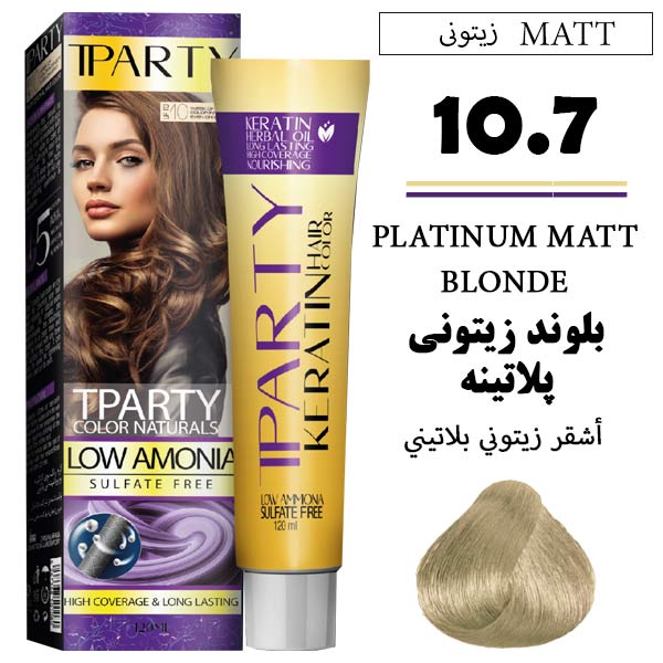رنگ مو تی پارتی بلوند زیتونی پلاتینه 10.7 یکی از محبوب ترین رنگ های روشن با تناژ سرد و انعکاس زیتونی است این رنگ با پایه روشن بلوند و رگه های زیتونی، جلوه ای طبیعی، مات و اروپایی ایجاد میکند و از ایجاد زردی و طلایی ناخواسته جلوگیری میکند.